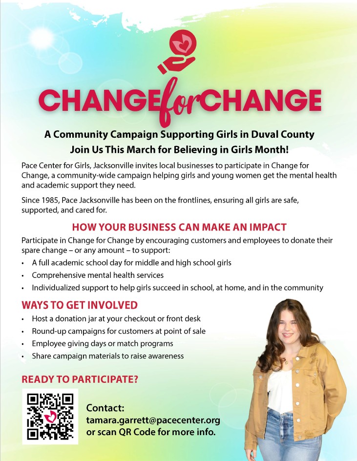 March is Believing in Girls Month at Pace Jacksonville — a time to celebrate and uplift the girls in our community. This year, we’re inviting local businesses and community partners to join us by participating in Change for Change, a simple and meaningful round-up campaign where customers can “round up” their purchase to the nearest dollar to support the girls at Pace.